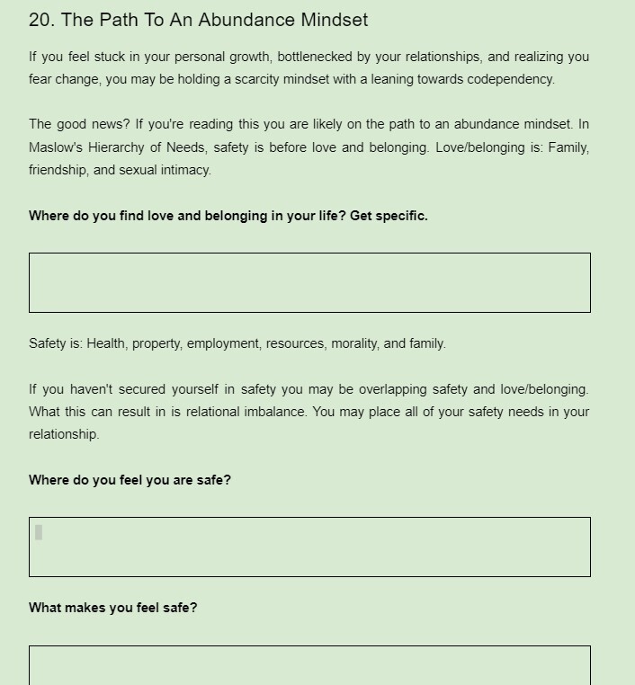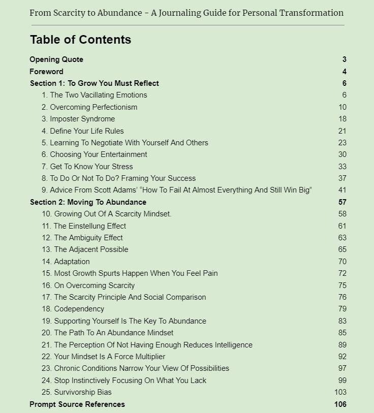 It is a journal prompt guide with the inspiration from the prompts sourced from my writings and synthesized from others content that resonated while I worked (am working) on my own journey from a scarcity mindset to one of abundance.